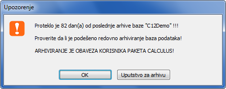 Obična obaveštenja - samo ispisuju određenu poruku kojom se korisnik obaveštava da je određena (dugotrajnija) operacija obavila posao ili da je pokušaj izvođenja neke operacije zabranjen u tom trenutku. Ovakve poruke imaju samo jedno dugme "Potvrdi", kojim se programu stavlja do znanja da smo poruku pročitali i da može da nastavi rad (vidi sliku)