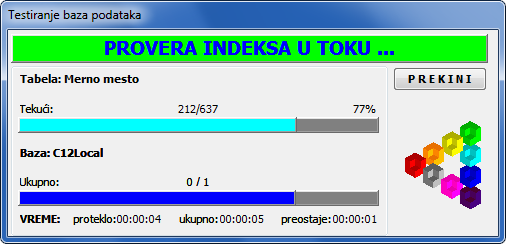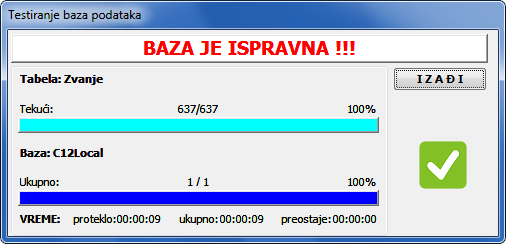 Ukoliko se tokom testiranja pronađu oštećeni indeksi, program će otvoriti prozor za oporavak indeksa sa prikazom upravo tih oštećenih tabela. Ako je baza ozbiljnije oštećena i tokom testiranja dođe do gubljena konekcije ili pada baze podataka, dobićete samo poruku o oštećenim tabelama, a indeksiranje morate da startujete "ručno" dugmetom Indeksiraj. Ukoliko je baza ispravna program javlja da je baza ispravna (vidi sliku)