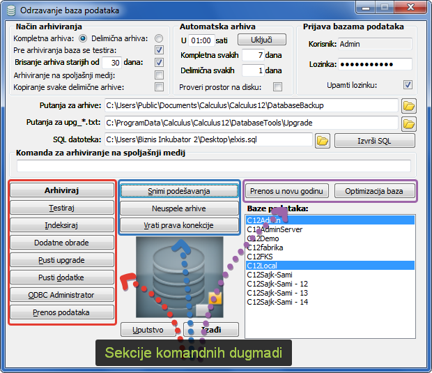 Sve operacije može starovati samo korisnik "Admin", koji ima administratorska prava i koji unosi loiznku u sekciju "Prijava bazama podataka" u polje "Lozinka:". Administratorsko korisničko ime i lozinka primenjuju se za sve izabrane baze podataka, što znači da u svim izabranim bazama korisničko ime i lozinka administratora moraju biti isti.