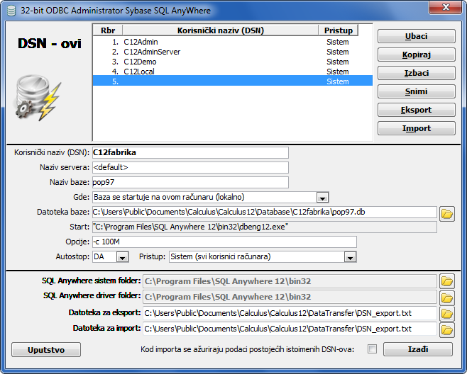 Primer povezivanja klijenta na lokalnu bazu podataka sa korisničkim nazivom (DSN) - C12fabrika (vidi sliku)