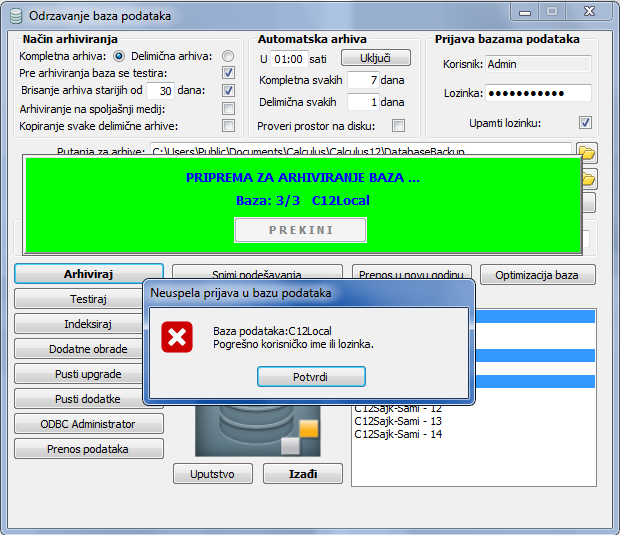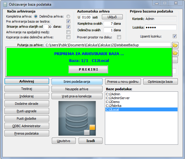 Dugmetom "Arhiviraj" pokreće se procedura za arhiviranje baza podataka (Backup) (vidi sliku)