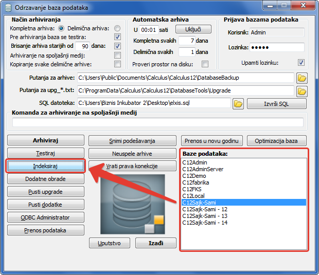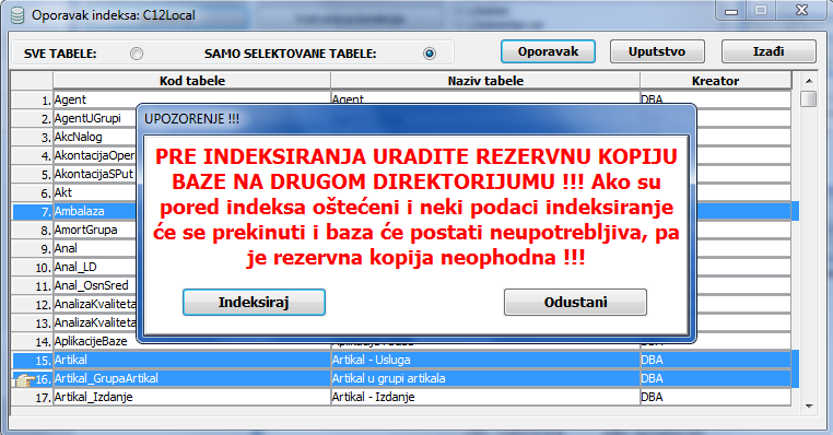 Pre pokretanja procedure indeksiranja obavezno arhivirajte bazu za slučaj da se indeksiranje iz bilo kog razloga ne završi u potpunosti (vidi sliku)