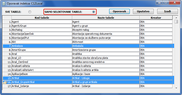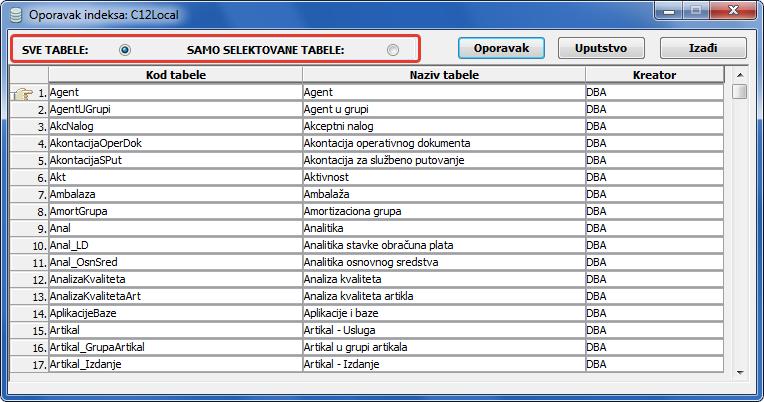 Spisak tabela za oporavak selektovanih indeksa. ili sve ponuđene tabele (vidi sliku)