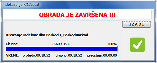 Tok indeksiranja.. Po završenom indeksiranju dobićete poruku " Obrada je završena" (vidi sliku)