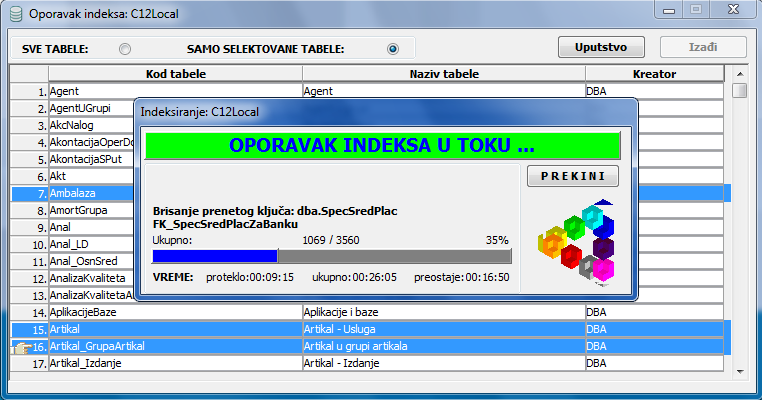 Preporučljivo je da se uvek obavi indeksiranje svih tabela. Tokom indeksiranja možete pratiti koje se tabele trenutno indeksiraju (vidi sliku)
