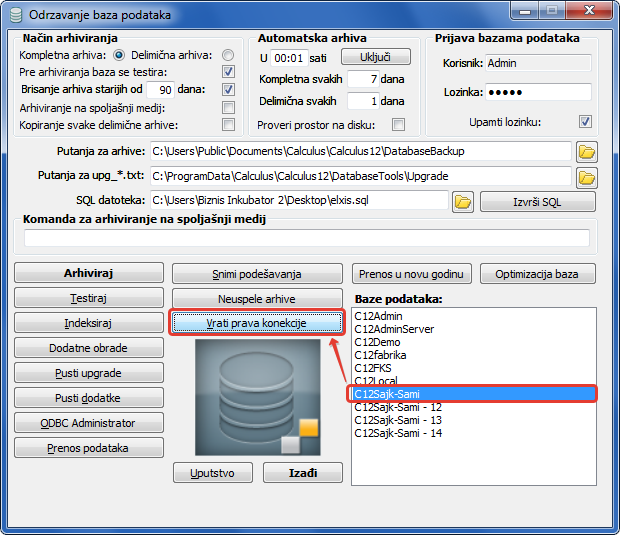 Vračanje prava konekcije mogu se pokrenuti samo nad jednom bazom (vidi sliku)