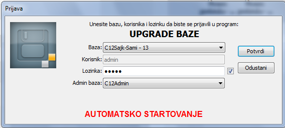 Prozor za automatsku prijavu bazi..