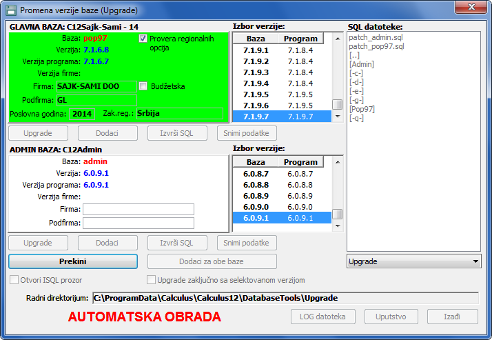 Automatska obrada teče u prozoru "Upgrade baze" u kome možete pratiti promene varijanti (vidi sliku)