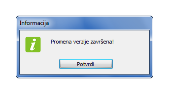 Nadogradnja (upgrade) je uspešno završena porukom "Promena verzije završena". Kliknite na dugme "Potvrdi" za kraj. (vidi sliku)
