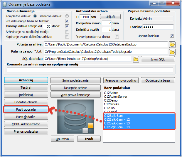 Program Upgrade baze morate više puta startovati za više baza podataka. Kada je broj instaliranih baza velik, ovo može biti zahtevan posao. U programu za Održavanje baze podataka", selektujte baze za koje želite da uradite nadogradnju (upgrade) kako biste jednim potezom odradili kompletan posao (vidi sliku)