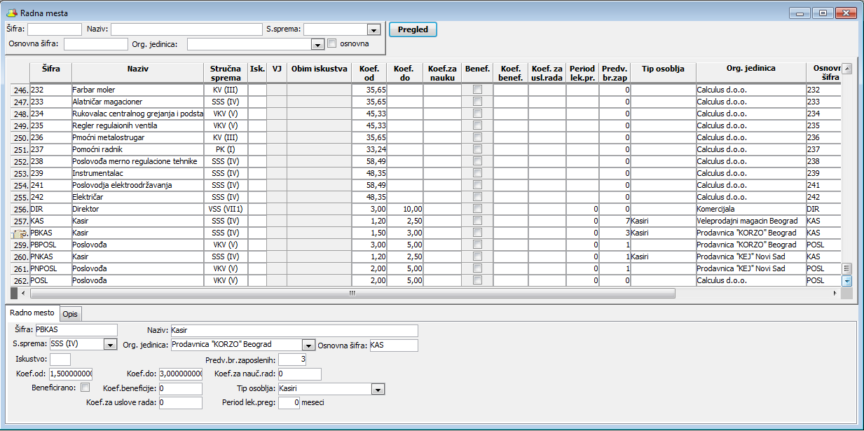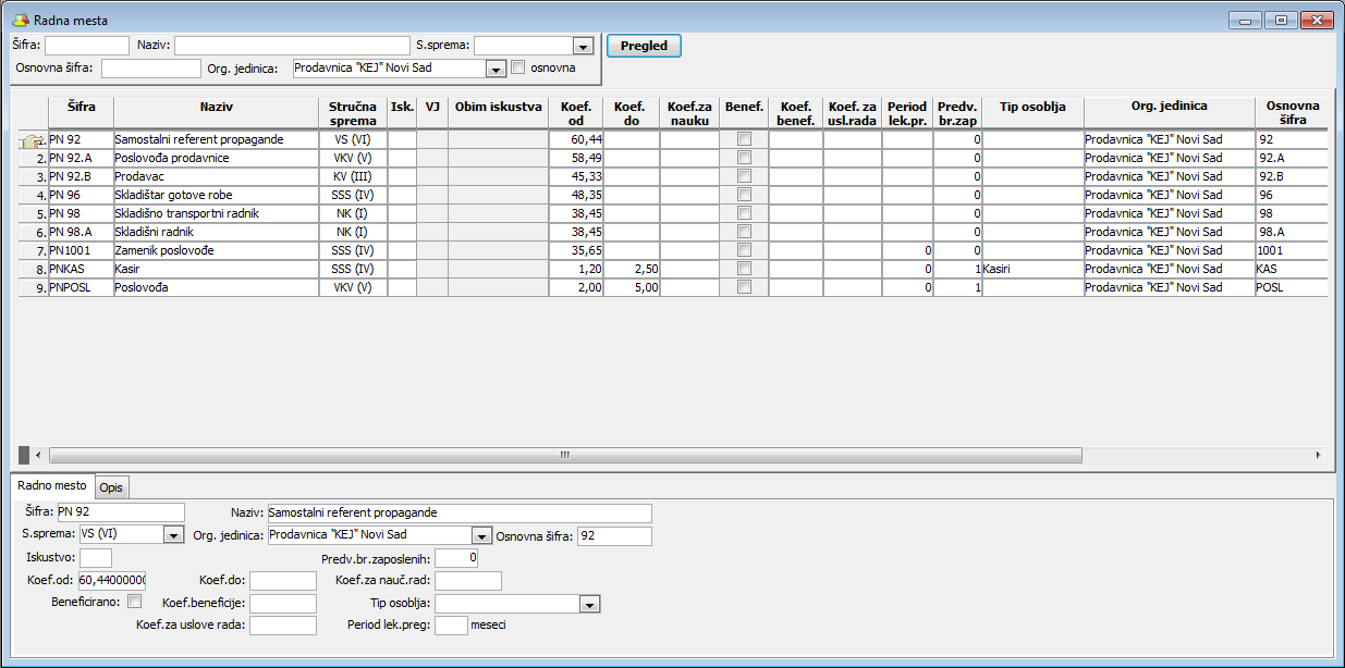 Na ovaj način možete imati više radnih mesta sa istim nazivom ali sa drugačijim koeficijentima i opisima posla ako je to radno mesto na različitim organizacionim jedinicama.