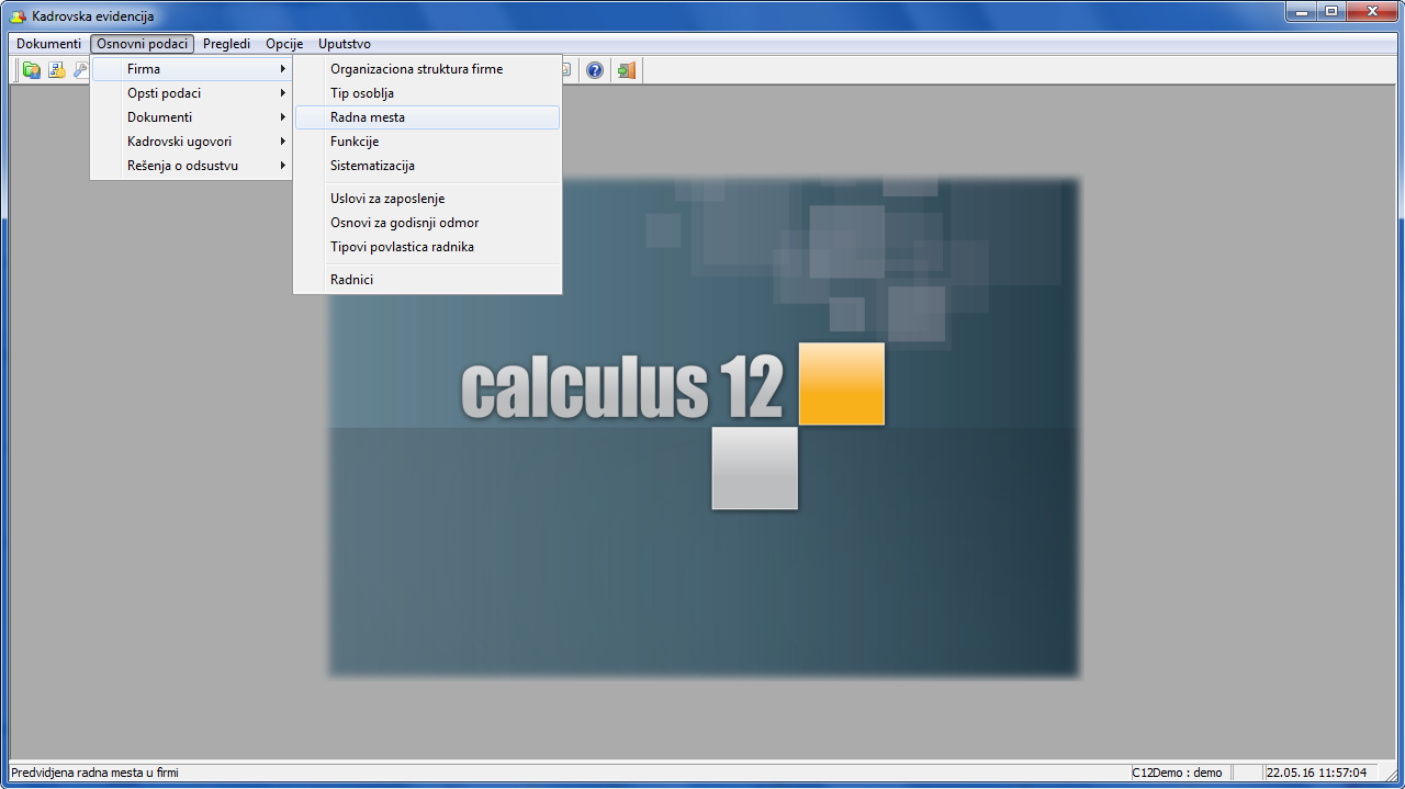 Podaci o radnom mestu kao i njihova dopuna mogu se unositi i u programu Kadrovska evidencija iz opcija glavnog menija, na sledeći način "Osnovni podaci - Firma - Radna mesta" ili klikom na ikonu osnovnog menija "Radna mesta"
