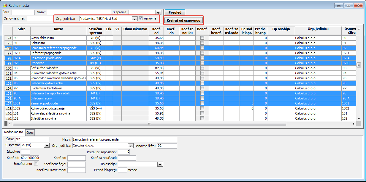 Na radnim mestima potvrdite ček polje "Osnovna" i kliknite na dugme "Pregled". Izlistaće se sva osnovna radna mesta i pojaviti dugme "Kreiraj od osnovnog" ( vidi sliku )