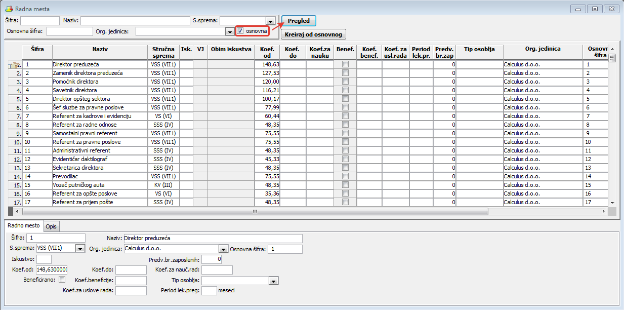 Nakon uspešnog formiranja radnih mesta otkačite polje osnovna i kliknite na dugme "Pregled" kako biste izlistali nova radna mesta