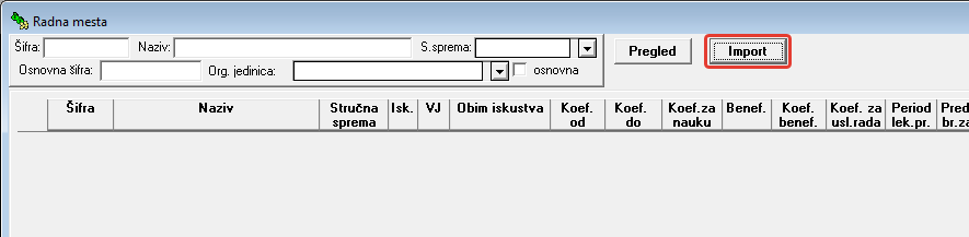 Import radnih mesta vrši se klikom na dugme "Import" iz prozora za radna mesta ( vidi sliku )