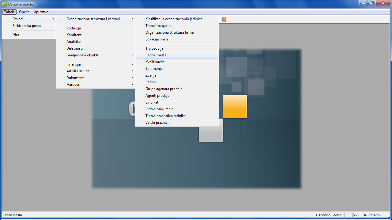 U glavnom meniju programa "Osnovni podaci" odaberite stavku, "Tabele - Otvori - Organizaciona struktura i kadrovi - Radna mesta" ili klikom na ikonu osnovnog menija "Radna mesta"