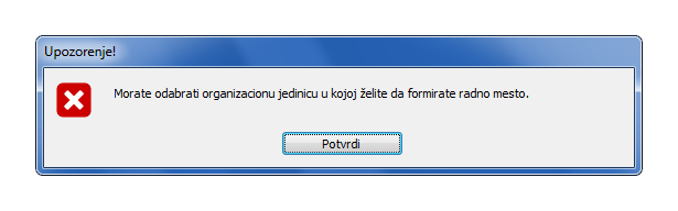 Ukoliko pre klika na dugme "Kreiraj od osnovnog" niste odabrali na kojoj organizacionoj jedinici želite da formirate nova radna mesta bićete upozoreni ( vidi sliku )