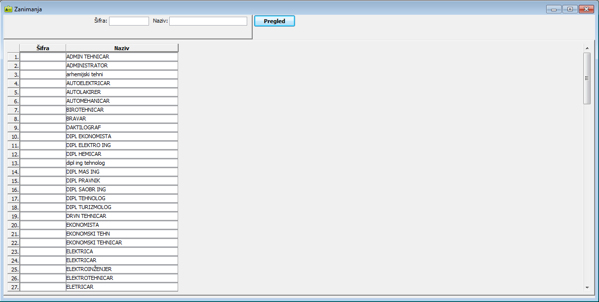 U prozoru "Zanimanja" definišu se zanimanja i njihove šifre. Pod zanimanjem se podrazumeva obrazovni profil koji se stiče