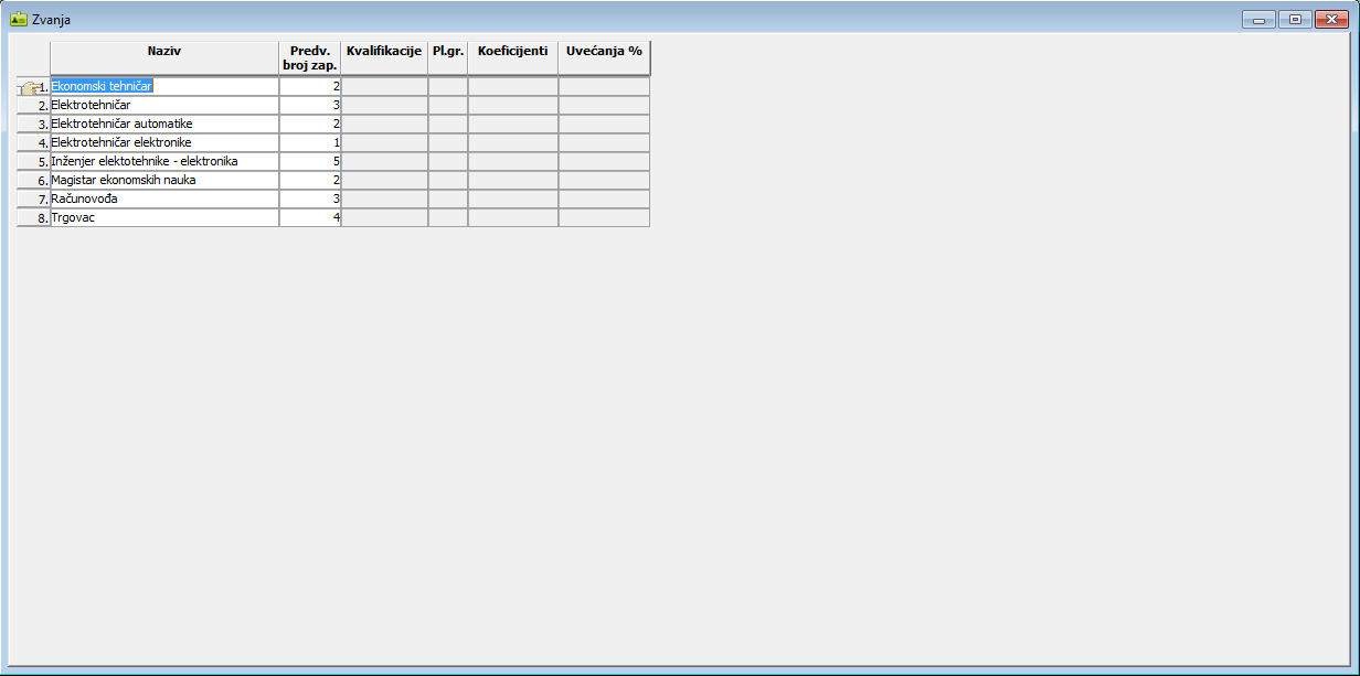 zvanje navodi se i predviđen broj izvršilaca sa određenim zvanjem. Ovi podaci su bitni pri unosu podataka vezanih za zaposlene (prozor "Radnici")