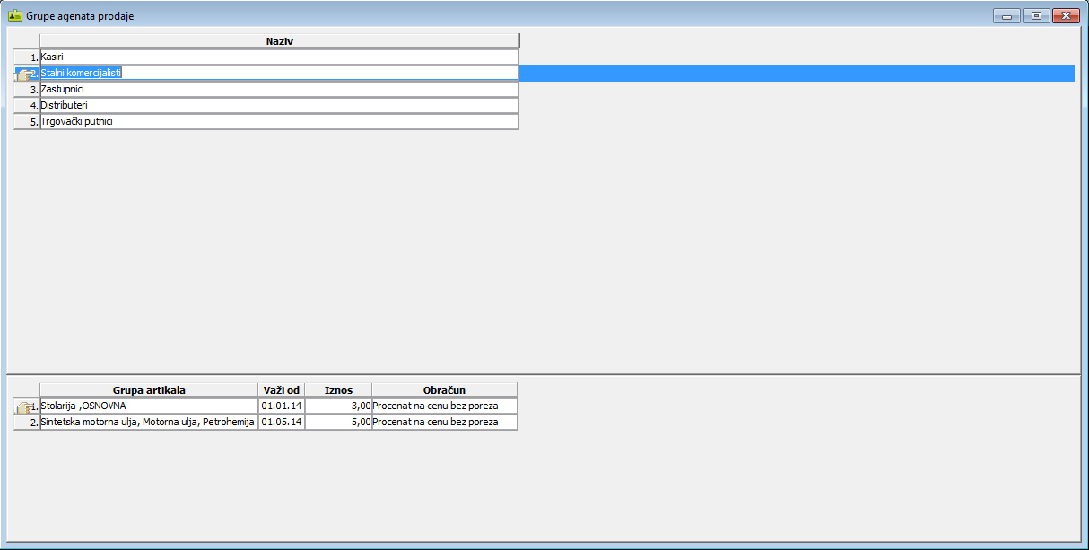 Prozor "Grupe agenata prodaje" sadrži grupe agenata koje imaju različita ovlašćenja, obaveze i različit sistem nagrađivanja (provizije) ( vidi sliku )