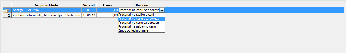 U donjem delu prozora, za tekuću grupu, specificira se način nagrađivanja i to po pojedinim grupama artikala koji su prodavani. Za svaku grupu artikala unosi se datum od kojeg va`i taj sistem nagrađivanja, zatim iznos i način tumačenja tog iznosa ("Obračun").