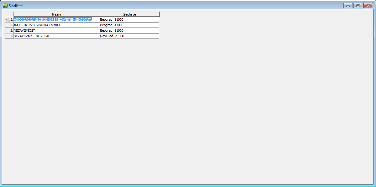 U prozoru "Sindikati" unose se podaci o nazivima i sedištima sindikalnih organizacija - sindikata