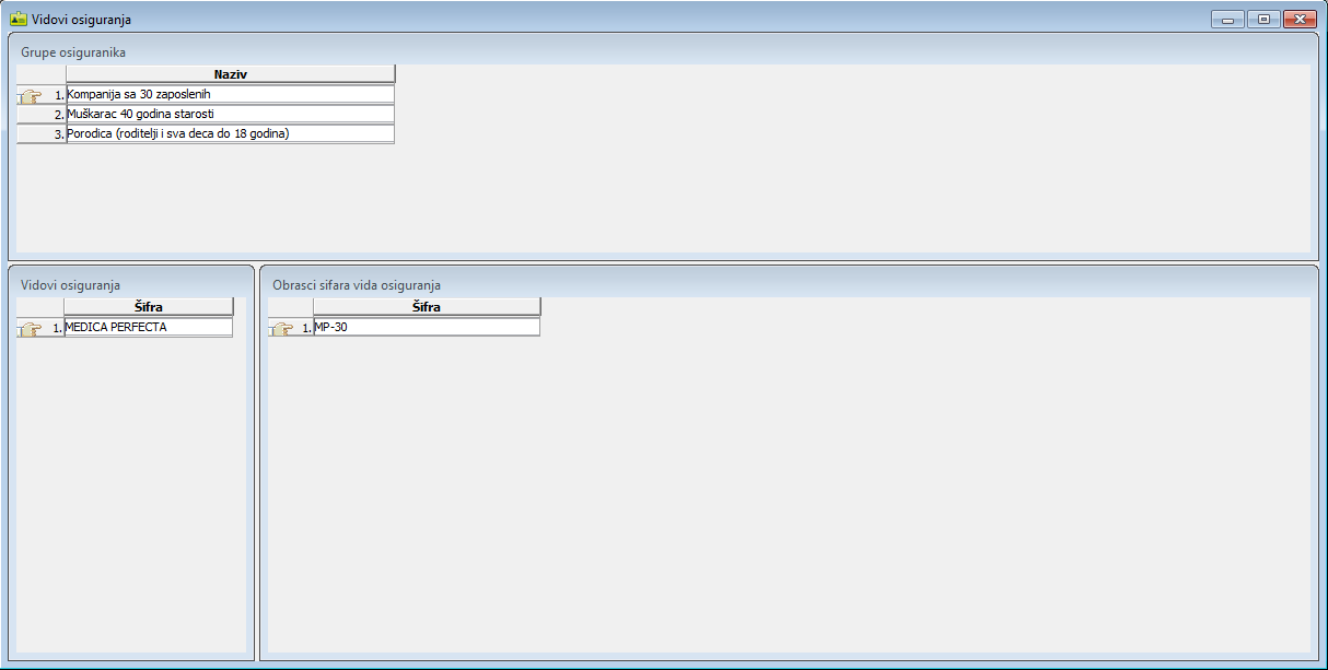 U prozoru "Vidovi osiguranja" unose se podaci o grupama i vidovima zdravstvenog osiguranja