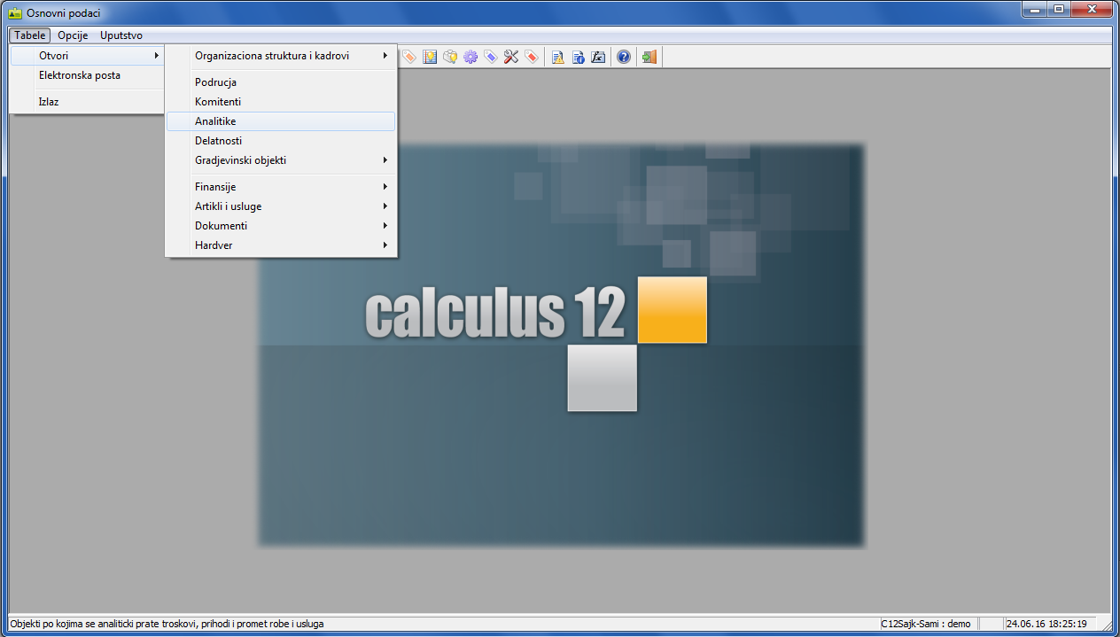 U glavnom meniju programa "Osnovni podaci" odaberite stavku "Tabele - Otvori - Analitike"