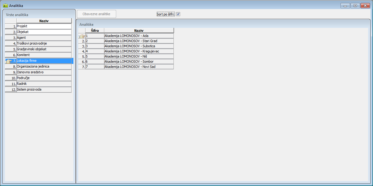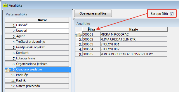 Polje za potvrđivanje "Sort po šifri:" koristite kada je potrebno da izlistane stavke selektovane analitike poređate po šiframa