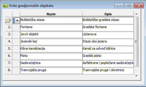 objekta koje definišete u prozoru "Vrste građevinskih objekata" što će Vam omogućiti u raznim pregledima efikasnije praćenje izvršenja