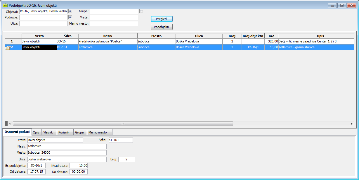 kriterijumima kao što su npr.: "Objekat:", "Područje:", "Ulica:", "Grupa:", "Vrsta:", "Merno mesto:".
