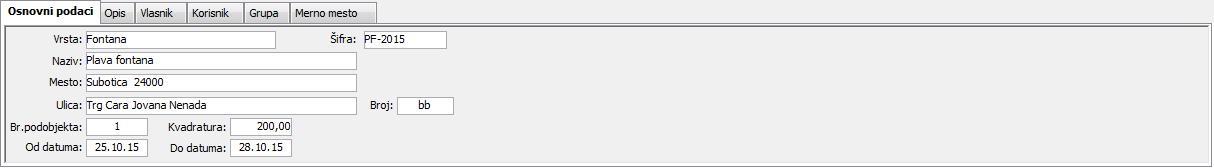 osnovni podaci o građevinskom objektu - "Osnovni podaci", opis građevinskog objekta "Opis", podatke o vlasniku objekta "Vlasnik",
