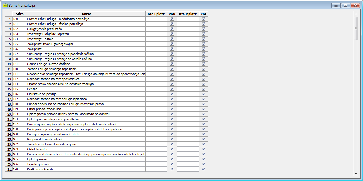 Prozor "Svrhe transakcija" služi za pregled specifikacije sredstava plaćanja po šiframa koje je propisao zakonodavac i nazivu transakcije