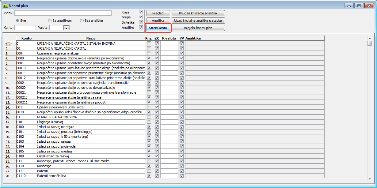 Da otvorite ovaj prozor u glavnom meniju programa "Finansije" odaberite stavku "Tabele - Otvori - Finansije - Kontni plan" i kliknite na dugme "Strani konto" ( vidi sliku )