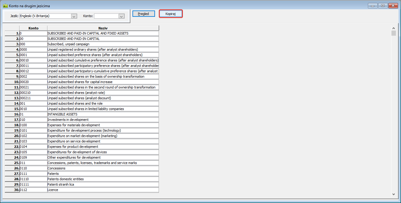 Izbor jezika obavlja se u filteru prozora "Konto na drugim jezicima" u polju "Jezik:". Dugmetom "Kopiraj" kopira se kompletan originalni kontni plan, posle čega je samo potrebno prevesti nazive konta ( vidi sliku )