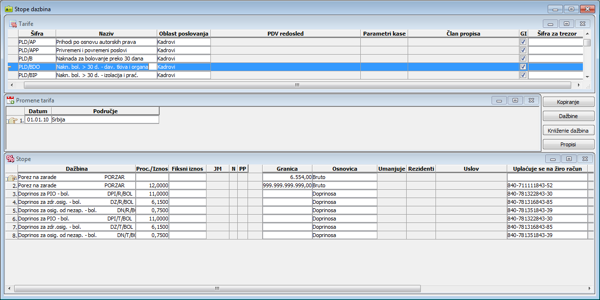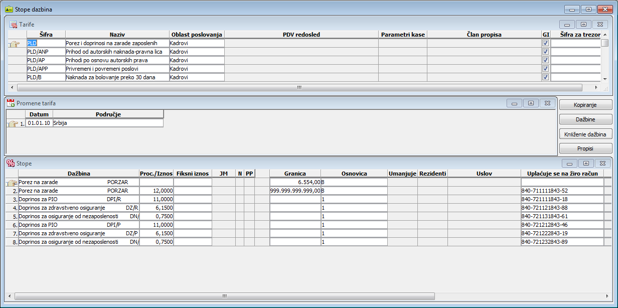 "Kopiranje stopa dažbina" u kome jednostavno i tačno popunjavate stope nove dažbine. U podprozor "Tarife" osnovnog prozora