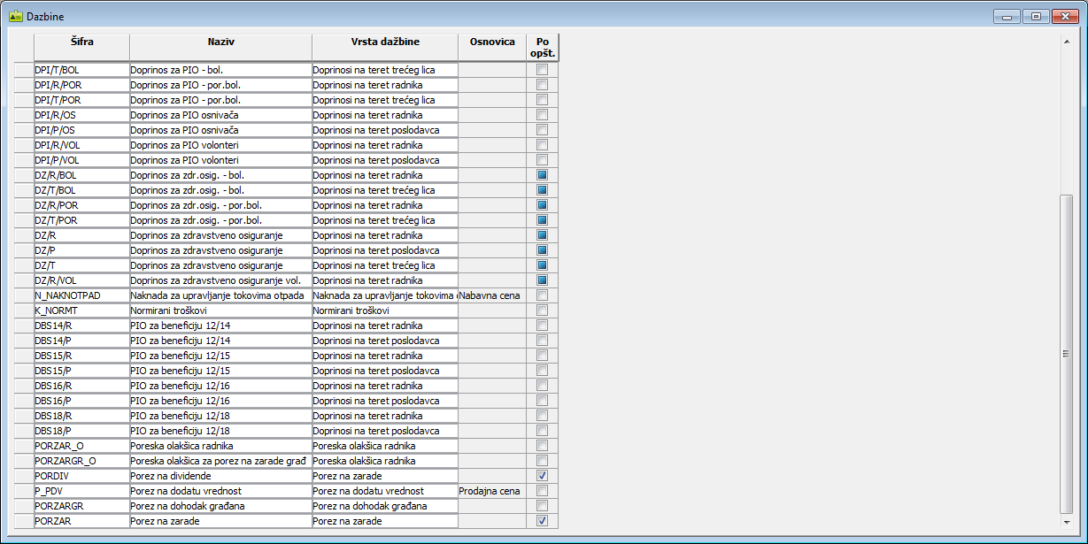 Prozor "Dažbine" u različitim programima može imati različit sadržaj. Kompletan spisak dažbina nalazi se