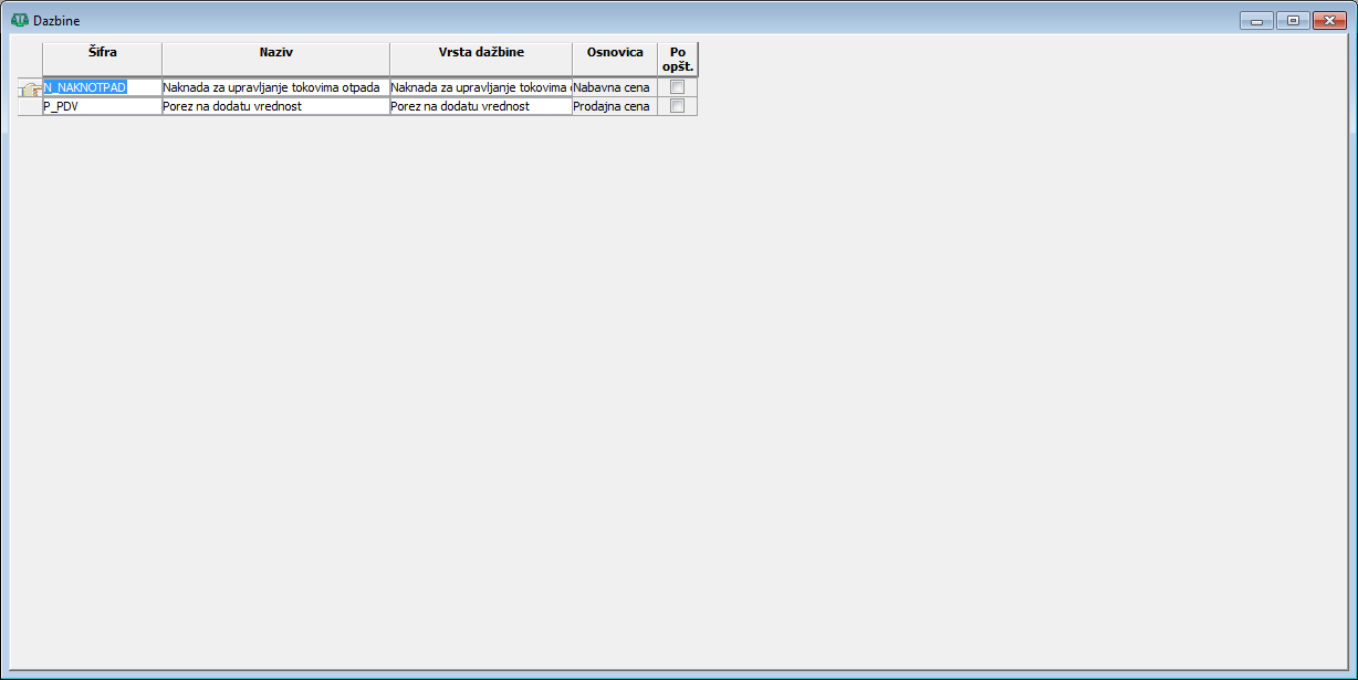 Kolona "Dažbina" - unose se dažbine definisane u prozoru za definisanje dažbina - Dažbine;