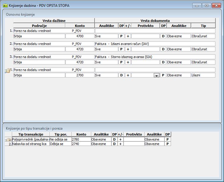 U podprozor "Knjiženje po tipu transakcije i poreza" unose se detaljna pravila za knjiženje za svako od pravila koje je uneto u prozoru "Osnovno knjiženje". Ova pravila direktno zavise od tipa transakcije, koji se unosi na ulaznim i izlaznim fakturama ("Poreski obveznik", "Nije poreski obveznik" itd.) i tipa poreza (odbija se, ne odbija se...). Tip poreza ima smisla samo kod ulaznih faktura, tako da je omogućen samo kada je osnovno pravilo definisano za ulazni porez. Za svaku od kombinacija tipa transakcije i poreza možete odrediti na koji će se konto knjižiti. Protivkonto je neobavezan, kao i kod osnovnog pravila. Ako neka kombinacija nije definisana, a pojavi se u dokumentu koji se knjiži, biće primenjeno osnovno pravilo za knjiženje.