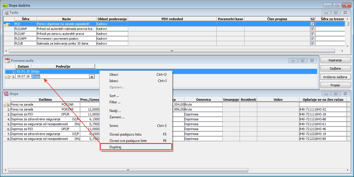 klikom miša na površinu podprozora "Promene tarifa" otvorite konteksni meni. Iz kontekstnog menija birajte stavku "Dupliraj". Stavka