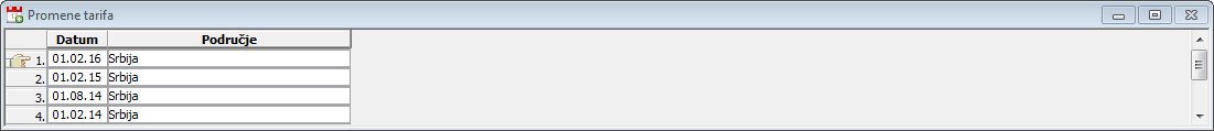 U podprozor "Promene tarifa" unose se promene tarifa sa datumom od kada se primenjuje u kolonu "Datum" i područjem na kojem se primenjuje uneta tarifa u kolonu "Područje". Klikni na donju sliku da je uvećaš.