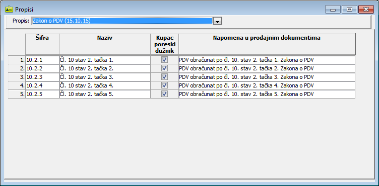 U prozor "Propisi" unose se elementi privrednih, računovodstvenih, poreskih, carinskih i drugih propisa sa kojima poslovne transakcije