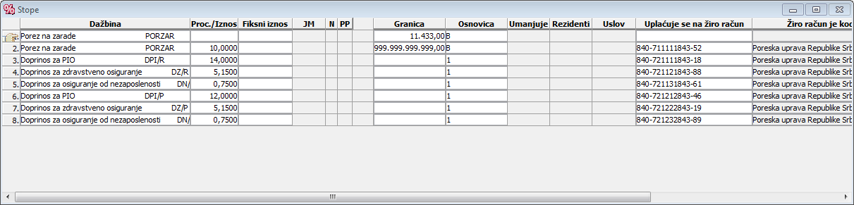 je neophodno dodati novu stopu poreza ili doprinosa dadajte je sa "CTRL+U", alter.: desni klik miša i izbor opcije "Ubaci" ili klikom