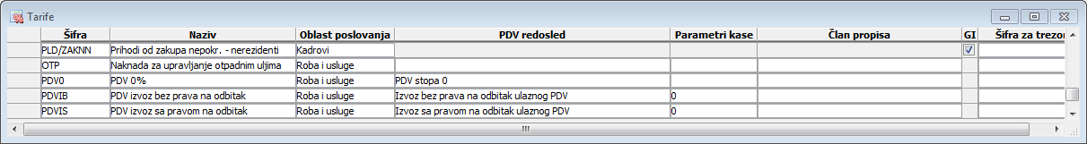 Kolona "Oblast poslovanja" - tarifa se vezuje za neku od oblasti poslovanja npr. za PDV postavlja se "Roba i usluge", za poreze i doprinose na zarade postavlja se "Kadrovi" itd. -
