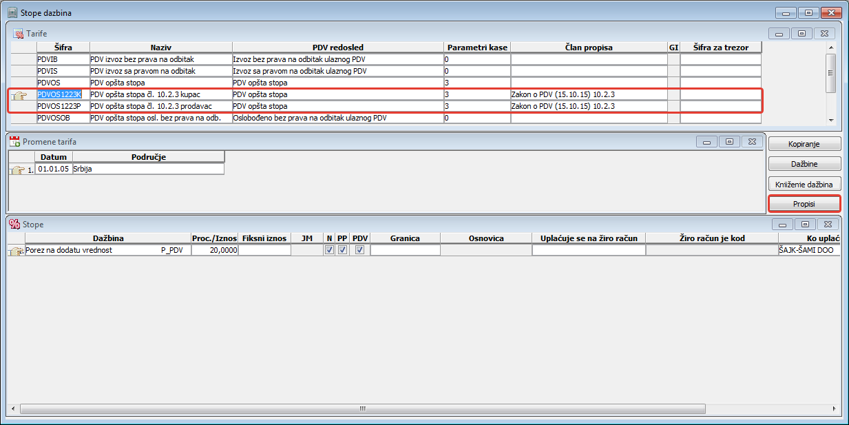 dugmetom "Propisi" u prozoru za stope dažbina (vidi sliku)