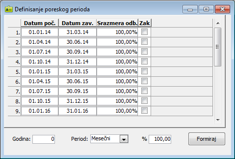 Prozor za definisanje poreskih perioda za svaki period sadrži polje za unos datuma početka poreskog perioda - kolona "Datum poč.", datuma njegovog završetka - kolona "Datum zav.", srazmeru odbijanja ulaznog PDV-a - kolona "Srazmera odb." i polje za potvrdu da je period zaključen - kolona "Zak".