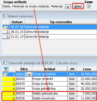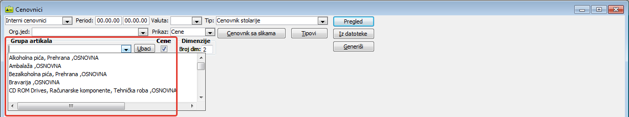 Sekcija sadrži polje za izbor grupe artikala, polje za potvrdu unosa cena ukoliko su formirane za artikle i dugme "Ubaci". Formirajte novi cenovnik u podprozoru "Interni cenovnici", izaberite u sekciji "Grupa artikala" grupu artikala kojom popunjavate novi cenovnik, ukoliko želite unos cena uz unete artikle potvrdite ček polje "Cene" i kliknite na dugme "Ubaci" ( vidi sliku )