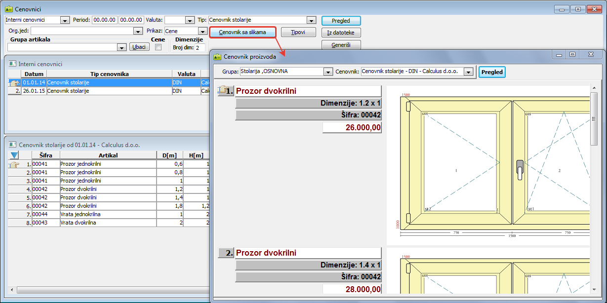 Klikom na dugme "Cenovnik sa slikama" dobija se cenovnik sa slikovnim prikazom artikala koji se u njemu nalaze ( vidi sliku )