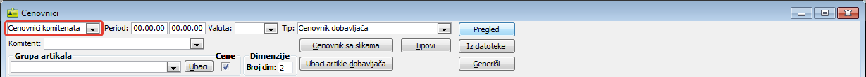 Prozor "Cenovnici" sa izabranom opcijom "Cenovnici komitenata" sadrži: