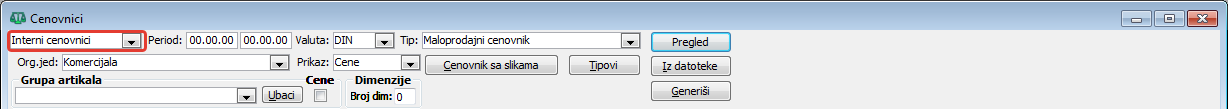 Filter sa opcijom "Interni cenovnici" - sastoji se od sekcije sa dugmadima i sekcije sa poljima filtera za definisanje kriterijuma pretraživanja - polje "Org.jed.:" po organizacionim jedinicama, polje "Period:" za određeni period, polje "Valuta:" po određenoj valuti, polje "Prikaz:" po vrsti prikaza u zavisnosti da li se žele videti cene ili njihove korekcije i polje "Tip:" za izbor tipa cenovnika koji će biti izlistan po datumima promene cena u izabranom tipu cenovnika ( vidi sliku )
